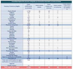 En la región de Los Lagos, según plataforma de notificación EPIVIGILA se han confirmado 3.702 casos de COVID-19, de los cuales 3.557 corresponden a la región, 124 personas que residen en otras regiones testeadas en la Región de Los Lagos y 21 casos del Crucero Silver Explorer, los cuales fueron confirmados en nuestra región, pero con contagio en el interior de la nave.