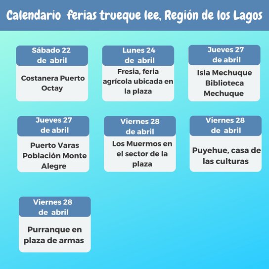 Pamela Altamirano Coordinadora regional de Bibliotecas públicas agregó que “en el marco de las actividades del mes del libro las bibliotecas de la región siguen con una nutrida programación continuando, por ejemplo con el Trueque Lee, que se instala en las Ferias municipales de la región, donde la biblioteca promueve el intercambio de libros, este sábado 22 abril se instalaran las bibliotecas en la feria Padre Hurtado de Puerto Montt, también en feria municipal de Calbuco, en isla Tac en Quemchi, en la feria de las pulgas de la ciudad de Ancud en la costanera de Puerto Octay en Fresia, entre otras comunas que se han ido sumando a la iniciativa. En tanto el 24 de abril se inaugura en la biblioteca de Achao el Bibliomóbil que llega a integrarse a la red de la región y el 28 de abril se inaugura bibliomóvil de San Juan de la Costa en Puaucho, entre otras actividades.”